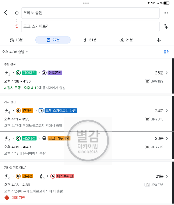 우에노공원에서 도쿄 스카이트리까지는 대략 30분 정도 예상하면 됩니다. 교통비는 대략 315엔 정도 잡으면 되구요.