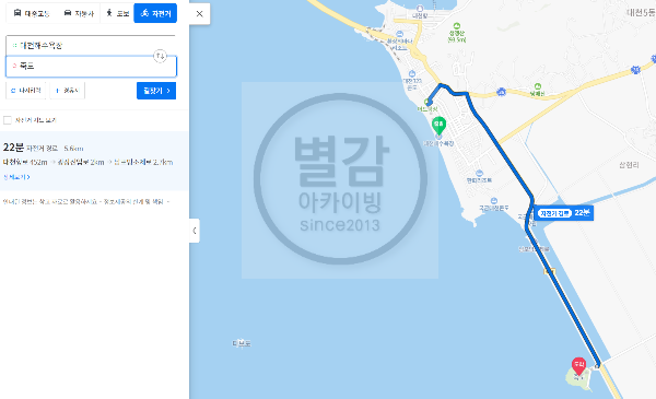네이버지도로 검색을 하면 대천해수욕장에서 보령의 죽도까지 약 5.6km이고 편도 22분 거리입니다.