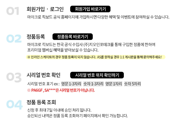 안전성과 내구성에서 최고인 마이크로킥보드. 공식홈페이지에 시리얼 번호를 입력하면 무상 AS는 1년동안 가능합니다.