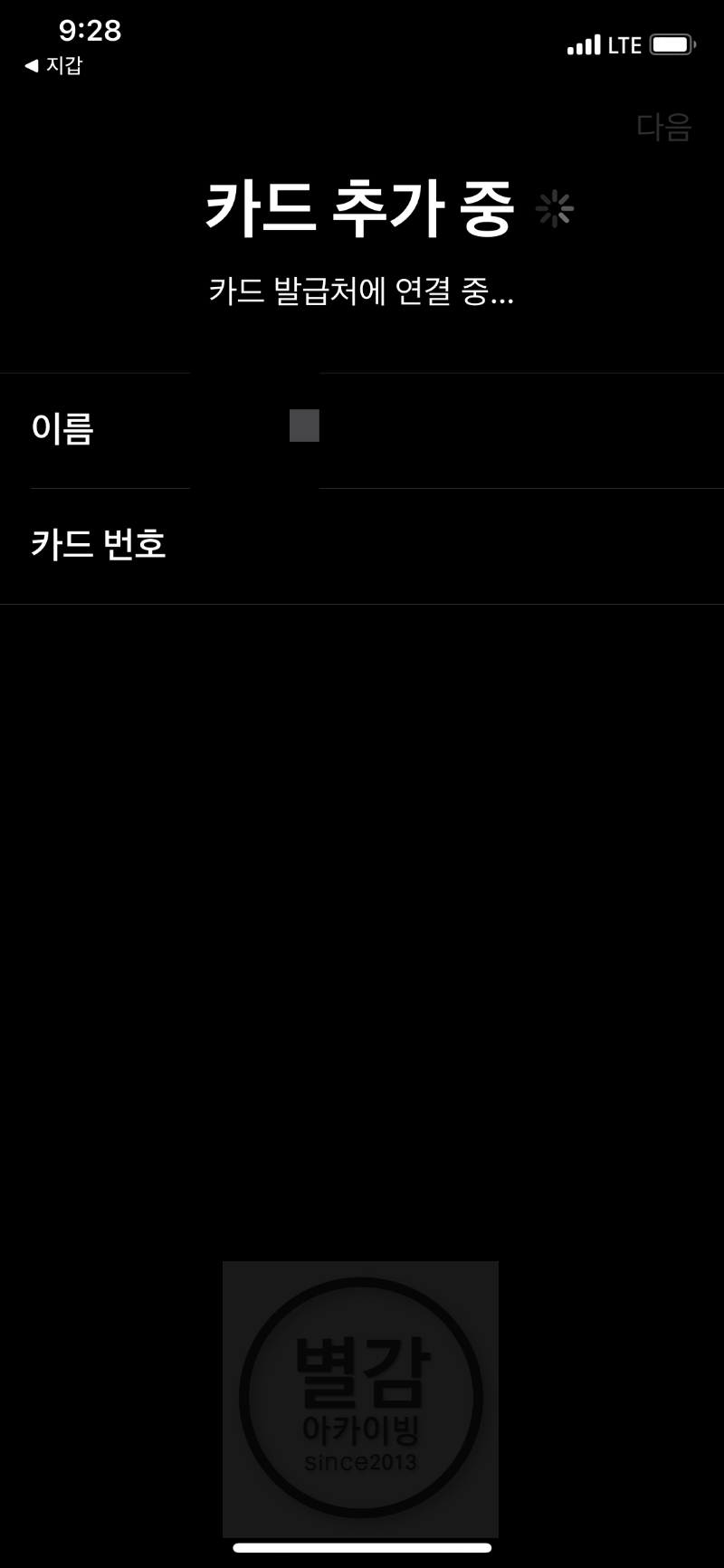 아이폰을 선택하니 위와 같이 카드 추가중이 나옵니다.