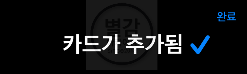 그러면 카드가 추가됨 화면이 뜨면서 애플페이 설치가 끝나고 사용할 수 있게 됩니다.