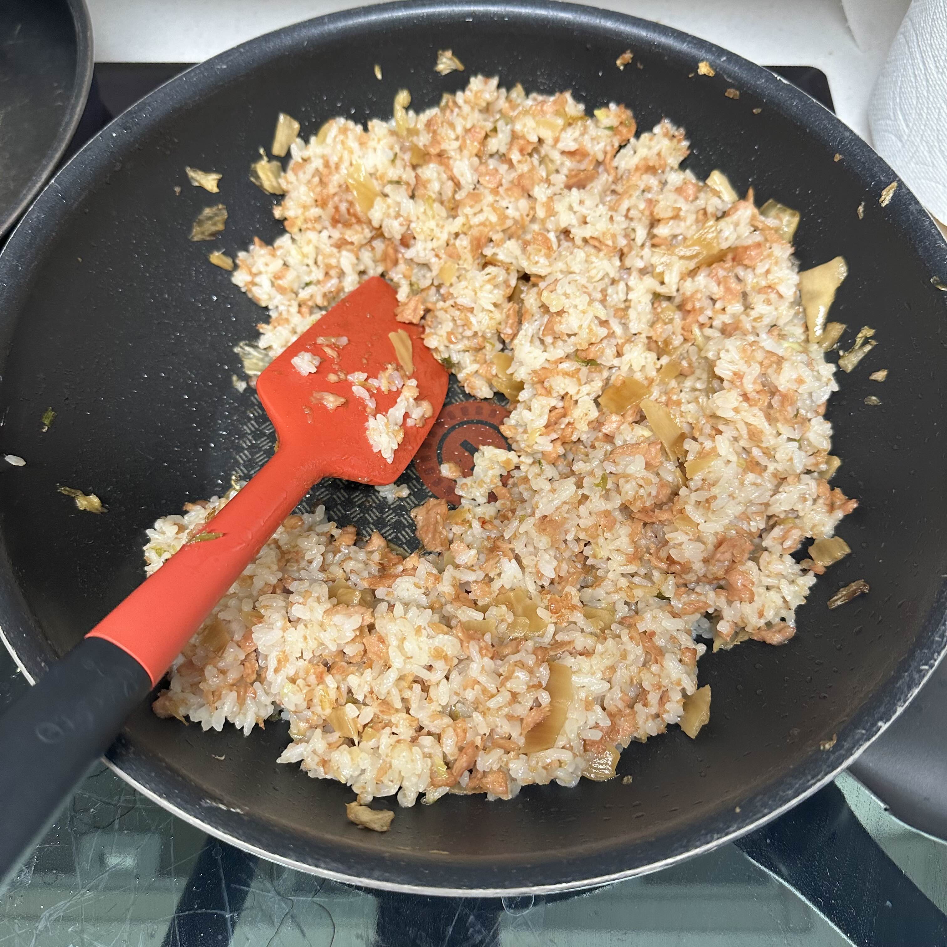 2. **스팸 으깨기**: 스팸을 꺼내서 포크나 숟가락으로 으깨줍니다. 너무 잘게 부수지 않아도 됩니다. 적당한 크기로 으깨서 팬에 넣고 함께 볶아줍니다. 스팸이 노릇하게 익을 때까지 계속 볶아주세요.